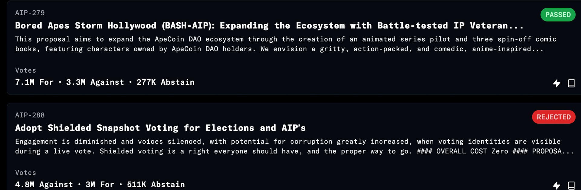 The end result is that more often than not, AIPs are rejected (via voting) out of hand - even when they meet and in some cases exceed the criteria established by the DAO since its inception.