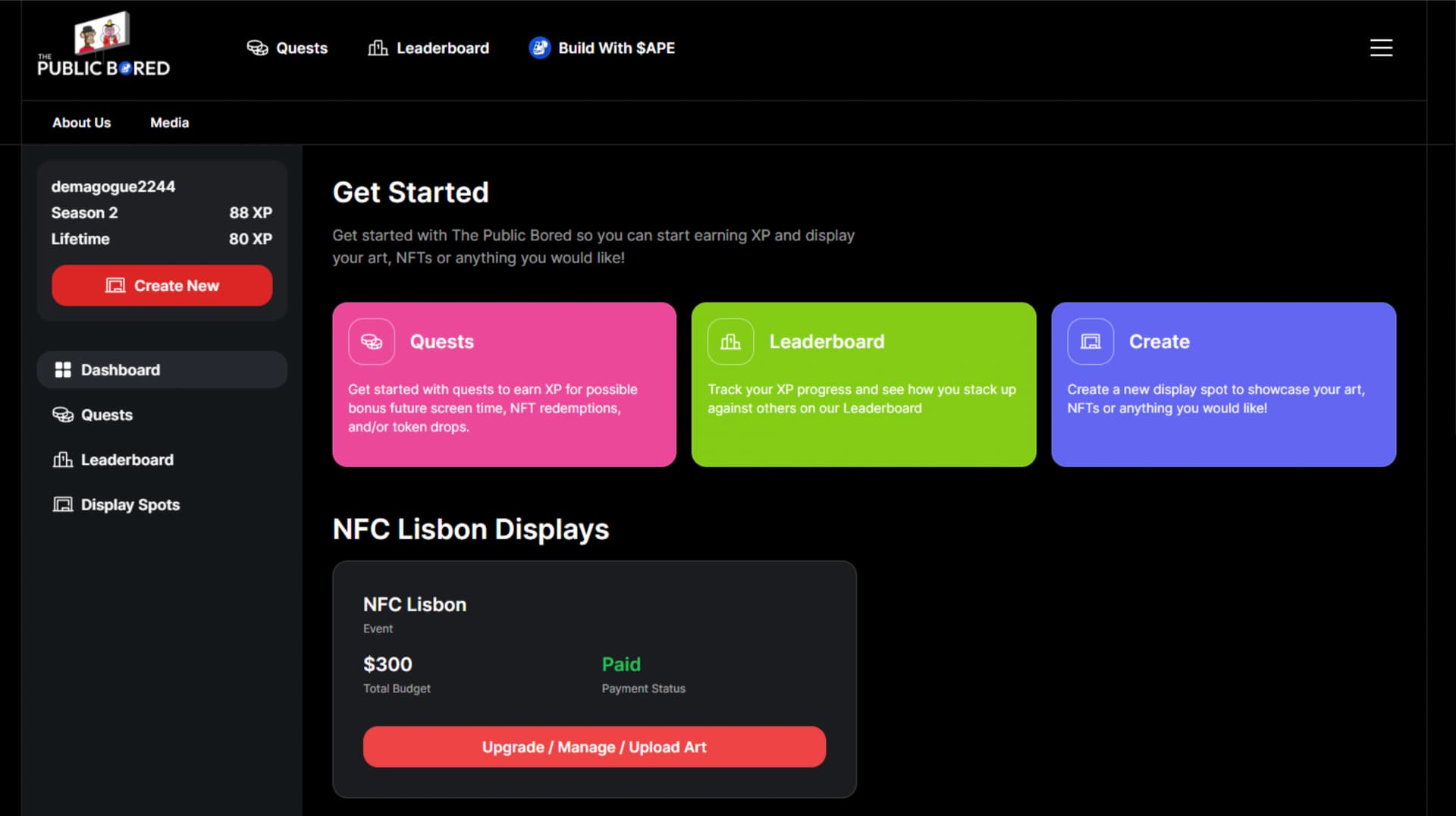 My name is Eric, I serve as Co-Founder and CEO of The PublicBored along with Bhargav, my Co-Founder and CTO. We built the treasury transparency dashboard through AIP-267 on ApeCoin.com, and the governance dashboard on apecoingwg.com. We launched The Public Bored with support from AIP-383, and brought the concept to two major activations at prominent Web3 events, engaging thousands of participants. Our first activation featured a digital billboard truck at the ETH Denver Hackathon and our second activation was an indoor digital display located front and centre at the main entrance to NFC Lisbon.