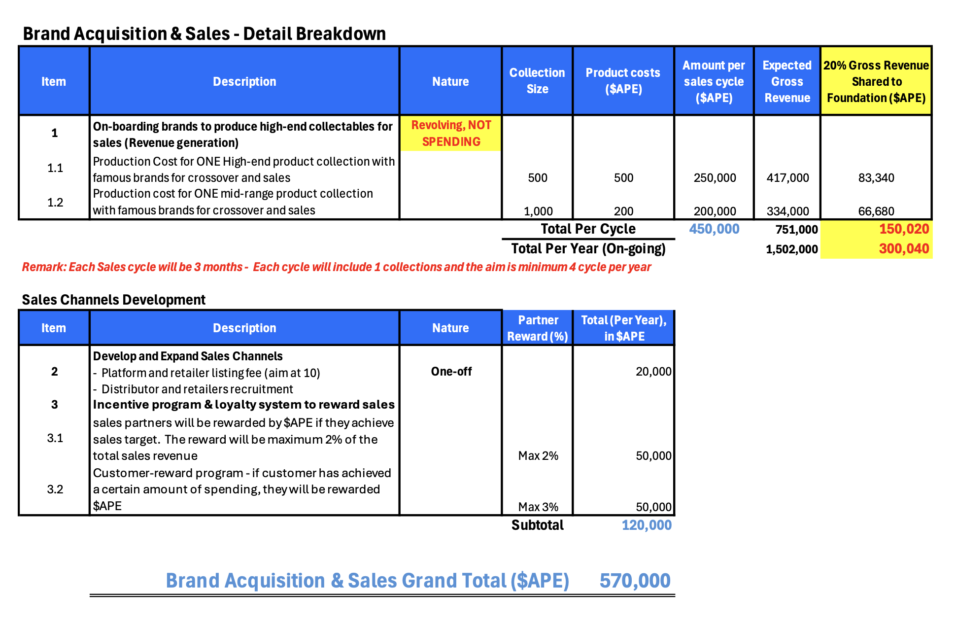 - Brand acquisition & associated production: 250,000 APE [Ongoing cashflow, not spending]