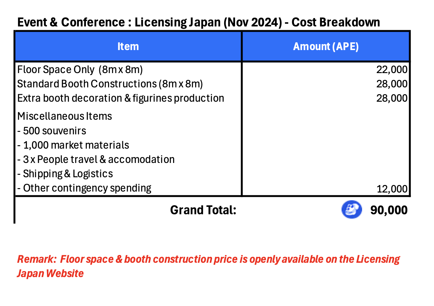 - Miscellaneous items, including souvenirs, marketing materials, 3 x people travel & accommodations, shipping & logistics: 12,000 APE
