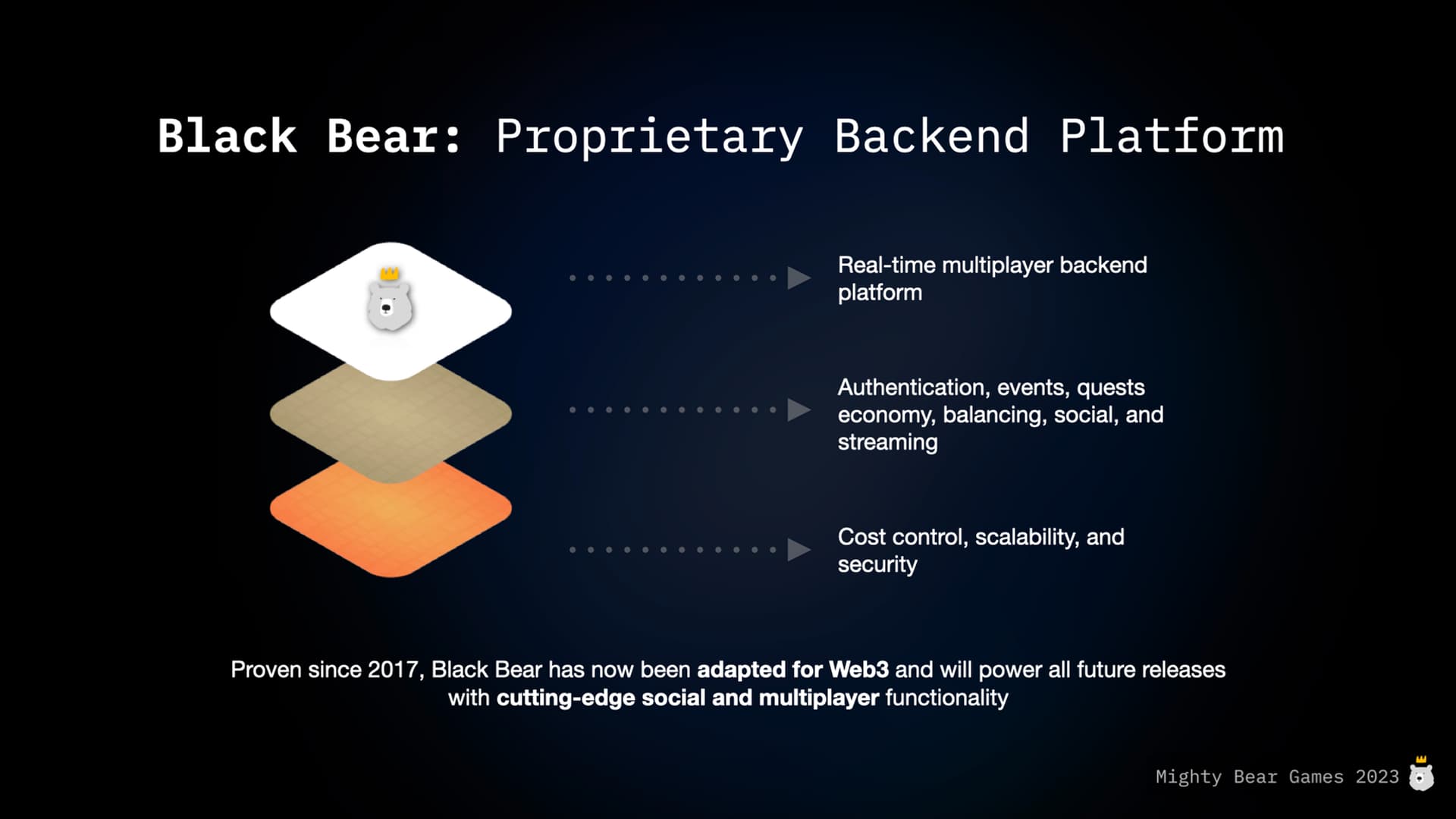 - Team built Black Bear atop seven years’ worth of proprietary tech. Black Bear is a backend for Web3 games (a layer online games can operate on, details in the graphic below) which we will share with partners to reduce risk and help get their games to market faster using proven tech. It’s already live in Mighty Action Heroes.