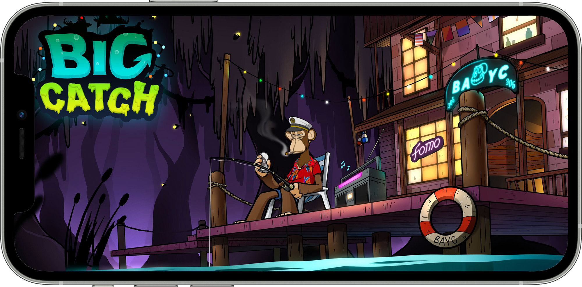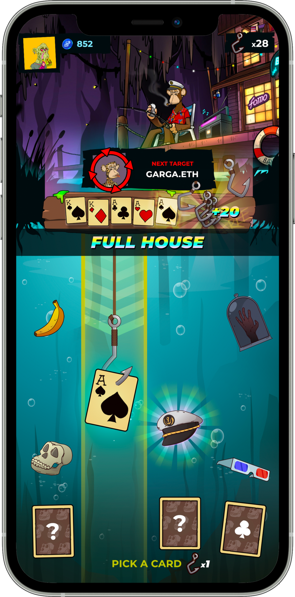 Example of what adding value to NFT holders could look like: in this concept event a player is able to fish up special event bonuses (such as the Captain’s Hat or 3D glasses) exclusive to the Yugaverse NFTs they own. The player could then choose whether to keep or sell these.