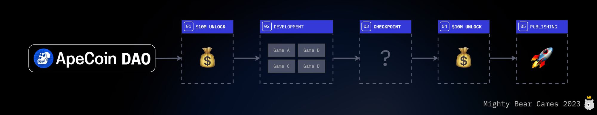 We are requesting $20 million in funding from the ApeCoin DAO to cover the development and publishing of multiple titles. This is to be paid in two tranches of $10M. The first tranche will be issued on approval of the proposal and the second tranche will only be drawn down once a game has proven product-market fit and a clear path to profitability.