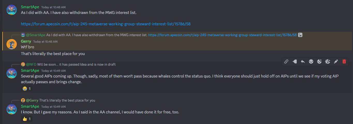 Following that, I also saw yet another incident of unfair treatment toward another ApeCoin DAO member. I decided to chime in because I felt that this person was already being unfairly attacked and derided for daring to create AIP-277 which sought to reduce the salaries of the members of the Special Council.