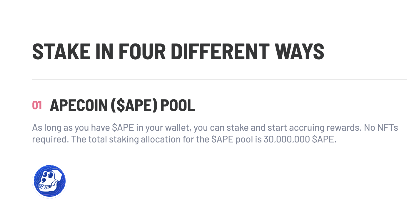 This AIP proposes a staking system for ApeCoin and the Bored Ape Yacht Club (BAYC) NFT ecosystem: Bored Ape Yacht Club, Mutant Ape Yacht Club (MAYC), and Bored Ape Kennel Club (BAKC). Staking participants will be able to stake ApeCoin and use the Bored Ape Yacht Club ecosystem NFTs to receive ApeCoin from a preset pool over a set period of time.